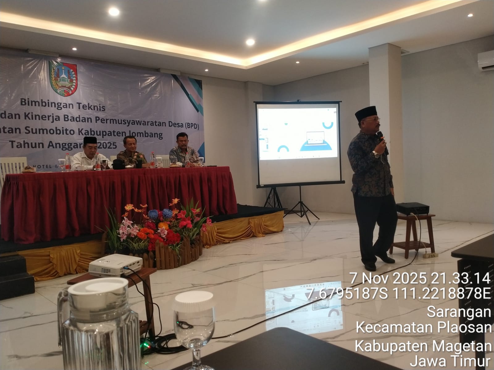 Badan Permusyawaratan Desa (BPD) memegang peranan yang sangat strategis dalam sistem pemerintahan desa. BPD adalah "parlemen"-nya desa, yang memiliki tiga fungsi inti: Legislasi,Pengawasan,Aspirasi. Bimbingan Teknis (Bimtek) untuk BPD se-Kecamatan Sumobito diselenggarakan karena adanya kebutuhan mendesak untuk memastikan seluruh anggota BPD di wilayah ini benar-benar memahami dan mampu menjalankan ketiga fungsi tersebut secara efektif. Oleh karena itu, Bimtek ini berfungsi sebagai "penyegaran" dan "peningkatan" ilmu agar BPD dapat menjadi mitra kritis yang konstruktif bagi Pemerintah Desa. Secara spesifik, Bimtek ini bertujuan untuk meningkatkan kapasitas dan kinerja BPD dalam beberapa aspek krusial: Peningkatan Pemahaman Regulasi, Penguatan Keterampilan Teknis, Optimalisasi Fungsi Pengawasan, Manajemen Aspirasi, Sinergi Kelembagaan. Dalam pelaksanaannya, Bimtek untuk BPD se-Kecamatan Sumobito Berfokus pada materi-materi berikut: Tata Kelola Pemerintahan Desa, . Teknis Fungsi Legislasi, Teknis Fungsi Pengawasan, Isu-Isu Strategis Desa, Bimbingan Teknis ini bukan sekadar kegiatan formalitas, melainkan sebuah investasi strategis untuk membangun tata kelola pemerintahan desa yang lebih demokratis, transparan, dan akuntabel di wilayah Kecamatan Sumobito. Transformasi BPD Menjadi Mitra Kritis yang Profesional Bimtek ini menegaskan bahwa BPD tidak boleh lagi hanya berfungsi sebagai "pelengkap" struktur desa. BPD harus bertransformasi menjadi mitra sejajar Kepala Desa yang profesional. "Mitra" berarti siap bekerjasama untuk kemajuan desa, namun tetap "Kritis" dalam menjalankan fungsi check and balances (pengawasan) agar kekuasaan di desa tidak dijalankan secara sewenang-wenang, Penguatan Kompetensi Berbasis Regulasi Kunci kekuatan BPD terletak pada penguasaan aturan, anggota BPD di Sumobito kini dituntut bekerja bukan berdasarkan "kebiasaan" atau "perasaan", melainkan berdasarkan regulasi (UU Desa dan turunannya). Dengan bekal materi teknis (penyusunan Perdes & analisis APBDes) yang didapat, argumen dan pengawasan BPD akan memiliki landasan hukum yang kuat dan sulit dibantah, Muara Akhir: Kualitas Pembangunan dan Kesejahteraan Warga Tujuan akhir dari peningkatan kapasitas BPD ini adalah dampak nyata bagi masyarakat. BPD yang kuat akan memastikan Dana Desa dan anggaran lainnya benar-benar tersalurkan untuk kebutuhan prioritas warga. Jika BPD se-Kecamatan Sumobito berkinerja tinggi, maka kualitas pembangunan desa akan meningkat, dan aspirasi masyarakat akan lebih terjamin realisasinya, Menciptakan Tata Kelola yang Baik: Muara dari kegiatan ini adalah terwujudnya BPD yang berkualitas dan percaya diri dalam bermitra dengan Pemerintah Desa. Kemitraan yang sehat ini adalah kunci untuk menciptakan tata kelola pemerintahan desa (Good Village Governance) yang transparan, akuntabel, dan partisipatif di seluruh wilayah Kecamatan Sumobito.