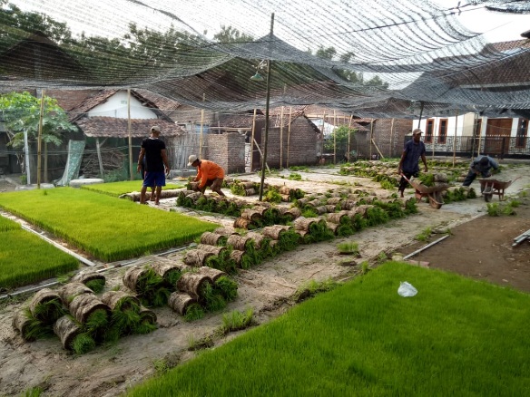 Kelompoktani Budug, yang berdomisili di Desa Budugsidorejo – kecamatan Sumobito tampak sedang sibuk dalam pembuatan pembibitan padi di pekarangan rumah. Praktis, efektif dan efisien. Itulah yang menjadi pertimbangan ketika mereka beralih sedikit demi sedikit ke arah pertanian modern dengan menggunakan mesin.Persemaian tidak perlu dilakukan di hamparan sawah. Bibit umur 15 hari sudah bisa pindah tanam.